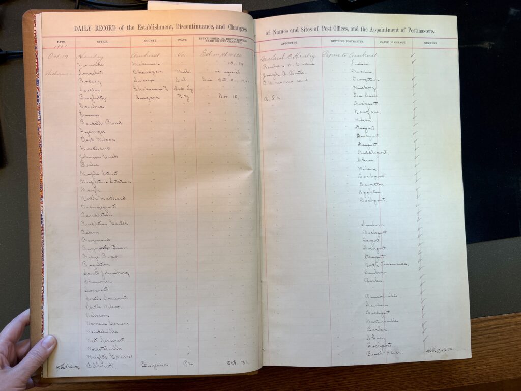 The same list of closing post offices was also put in RG 28, Entry 71 (volume 24): Daily Record of the Appointment of Postmasters and the Establishment, Discontinuance, and Name and Site Changes of Post Offices, 1899-1914.